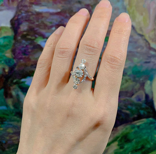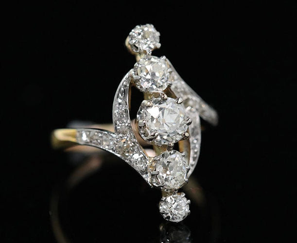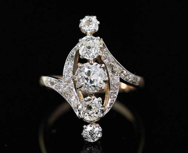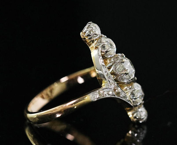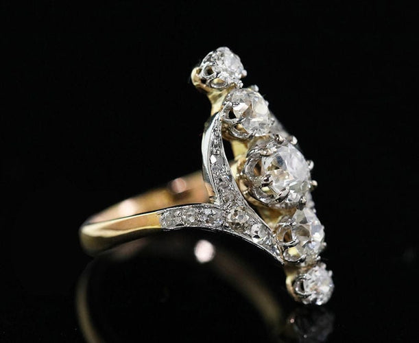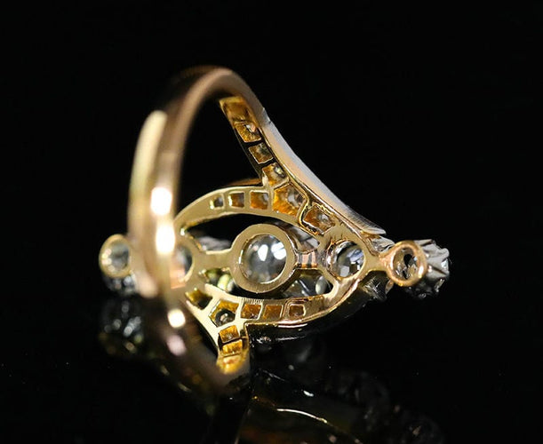 Anello d'oro e platino forma marchesina. L'anello con spallette di brillanti è diviso in modo da formare un castone allungato di diamanti, attraversato nel senso della lunghezza da una linea di brillanti "river", tutti incastonati platino. Il brillante principale, di buona qualità, senza inclusioni visibili, pesa circa 0,50 carati.