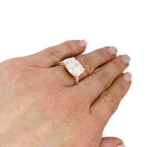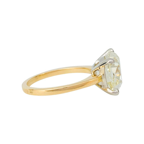 Un anello in oro rosa 750/000 e platino 950/000, incentrato su un vecchio diamante a forma di cuscino, 5,97 carati, colore M, purezza VS2.