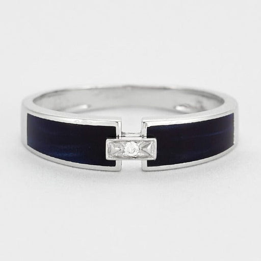 Anello Gigi Clozeau in oro bianco 18 carati (750 millesimi) centrato con motivo rettangolare ornato da un piccolo diamante taglio brillante di circa 0,02 carati incastonato a griffa, montato con smalto blu navy incastonato a castone.