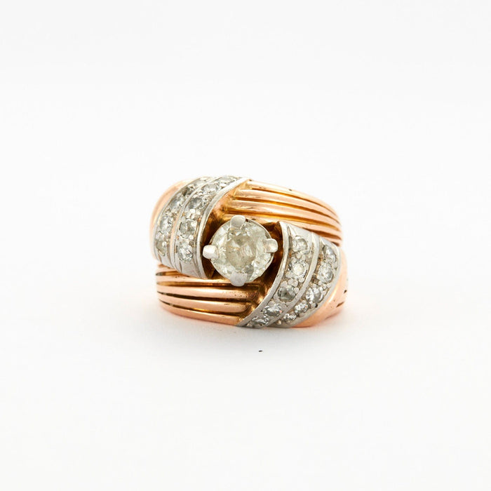 - Anello in oro giallo e oro bianco 18 carati (750 millesimi) bordato, sormontato da una fila di piccoli diamanti cadenti taglio 8/8 e centrato da un diamante taglio vecchio del peso di circa 0,60 carati.
