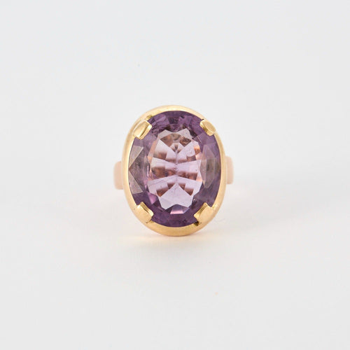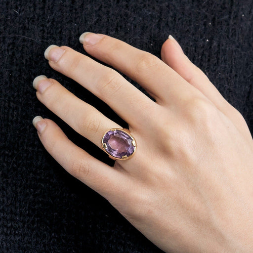 Anello in oro giallo 18 carati (750 millesimi) con ametista ovale sfaccettata.