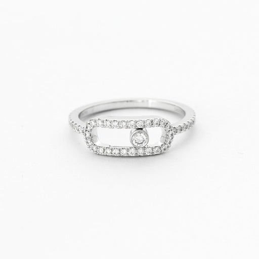 Anello "Move Uno GM Pavée" in oro bianco 18 carati (750 millesimi) che presenta un diamante mobile taglio brillante in una montatura chiusa, trattenuto da un corpo dell'anello decorato con diamanti taglio brillante del peso di circa 0,01 carati ciascuno. Firmato Messika e numerato con il marchio dell'autore.
