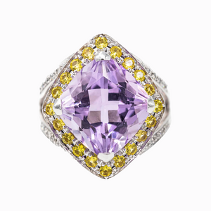 Cocktailring van geelgoud, robijnen, saffieren en smaragden. Tutti frutti-stijl.