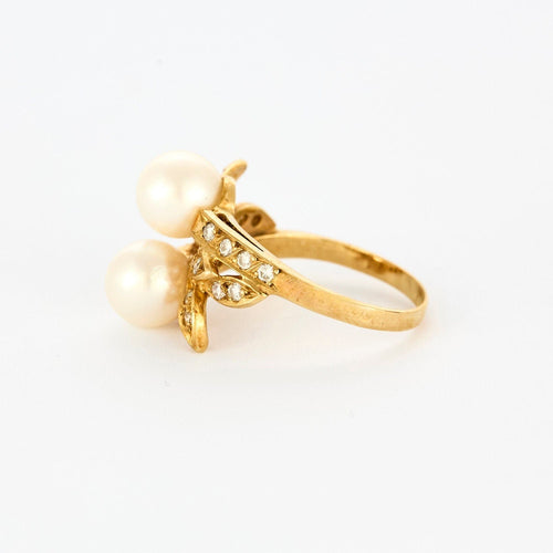 18K (750 duizendsten) geelgouden ring met gekruiste armbanden versierd met bladmotieven en in het midden twee witte gekweekte parels omzoomd met kleine briljant geslepen diamanten van elk ongeveer 0,02 karaat. Frans titelmerk.
