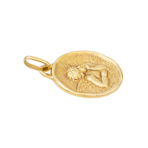 Ronde religieuze medaille in 750 duizendsten (18 karaat) geel goud, engel Raphaël, gesigneerd Augis, hoogte met borgtocht: 2,20 cm, breedte: 1,50 cm, totaal gewicht: 1,97 g, keurmerk adelaarskop, uitstekende staat