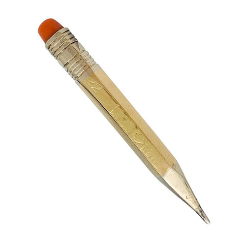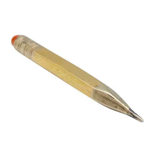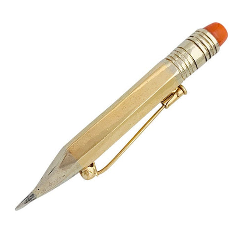 “Potlood” broche in twee kleuren goud en koraal.