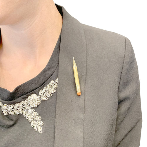 Een broche toegeschreven aan Yuri Kuper, serie 'Found Objects', in 750/000 geel- en witgoud met afbeelding van een potlood bezet met een oranje koraalgum.