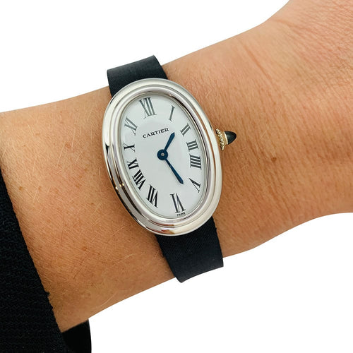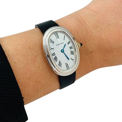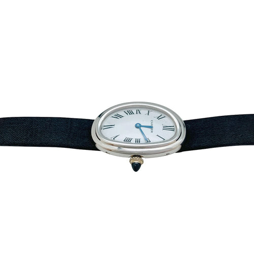 Een horloge gesigneerd door het huis Cartier model 'Baignoire' in 750/000 witgoud, dubbele gadroon-ring op een leren armband en bevestigde stalen doorngesp. Witte wijzerplaat, Romeinse cijfers.