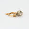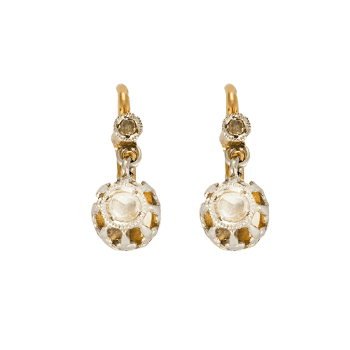 Paar 18-karaats (750/°°°) tweekleurige gouden oorbellen bezet met tweemaal twee roosgeslepen diamanten voor een geschat totaalgewicht van ca. 0,10 ct.