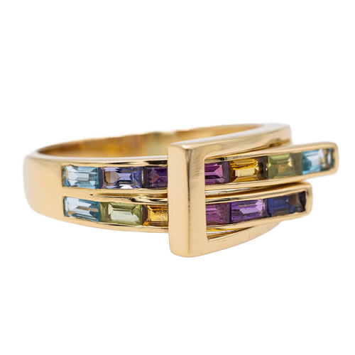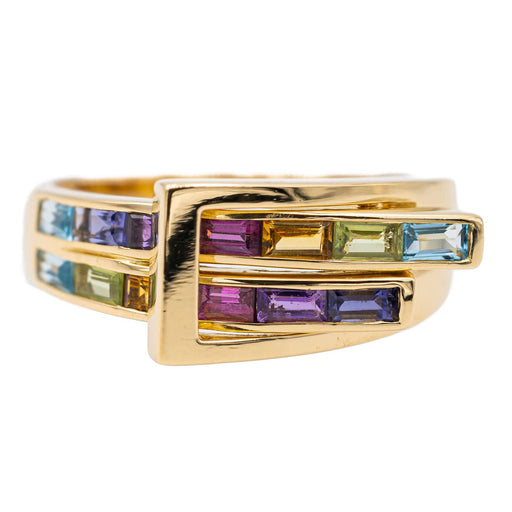 Ring Guy Laroche in 750 duizendste (18 karaat) geelgoud, bezet met 3 rechthoekig geslepen topaas, van circa 0,27 ct (elke topaas weegt circa 0,09 ct), bezet met 2 rechthoekig geslepen peridots, van circa 0,16 ct (elke peridoot weegt circa 0,08 ct) ), bezet met 2 rechthoekig geslepen citrienen, circa 0,14 ct (elk citrien weegt circa 0,07 ct), bezet met 2 rechthoekig geslepen amethisten, circa 0,14 ct (elk amethist weegt circa 0,07 ct), bezet met 2 rechthoekig geslepen toermalijnen, ca. 0,16 ct (elke toermalijn weegt ca. 0,08 ct), bezet met 2 rechthoekig geslepen cordierieten, van ca. 0,12 ct (elke cordieriet weegt ca. 0,06 ct), breedte bovenop: 0,87 cm, vingergrootte: 57,5, totaal gewicht : 5,67 g, kenmerk van adelaarskop, uitstekende staat