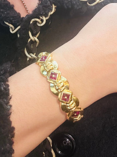Stevige armband van geelgoud en kleine rode steentjes in een ruitvorm.