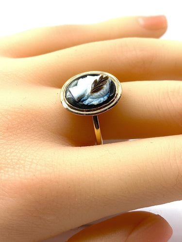 18-karaats geelgouden ring versierd met een driekleurige onyx-camee die het profiel van een antieke vrouw voorstelt, zeer fijn gegraveerd.