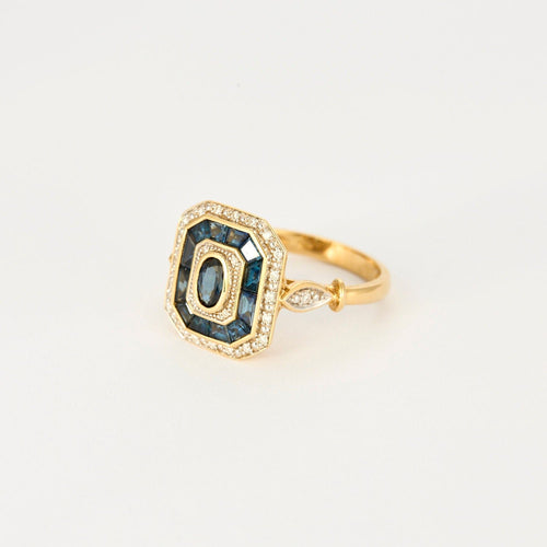 Ringstijl Art Deco geel goud, diamanten, saffieren