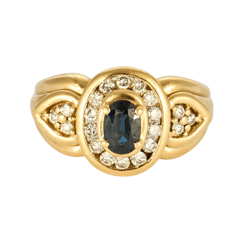 Ring van 18K (750 duizendste) geelgoud met daarop een ovale saffier van ongeveer 0,60 karaat in een viertandige zetting, omringd en ondersteund door ronde briljant geslepen diamanten die elk ongeveer 0,02 karaat wegen.
