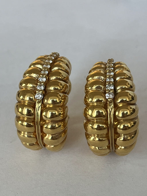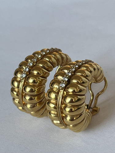 Een paar oorbellen bestaande uit dubbele, geplooide creolen van geelgoud (18 karaat) met daartussen een rij natuurlijke briljantgeslepen diamanten in korrelzetting.