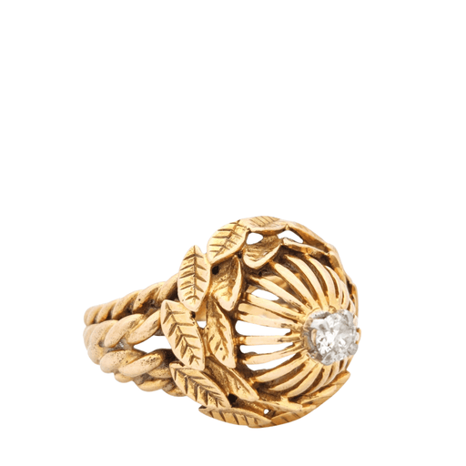 - Koepelring met bloemmotieven in geelgoud en diamant