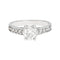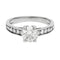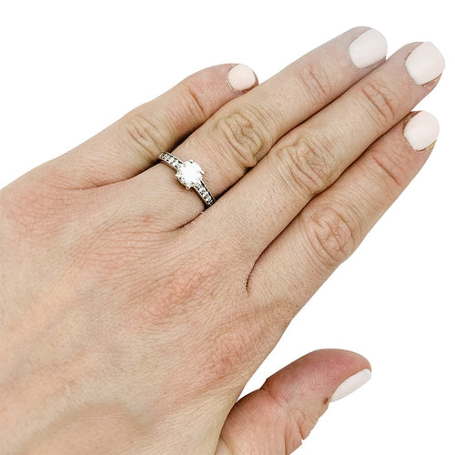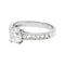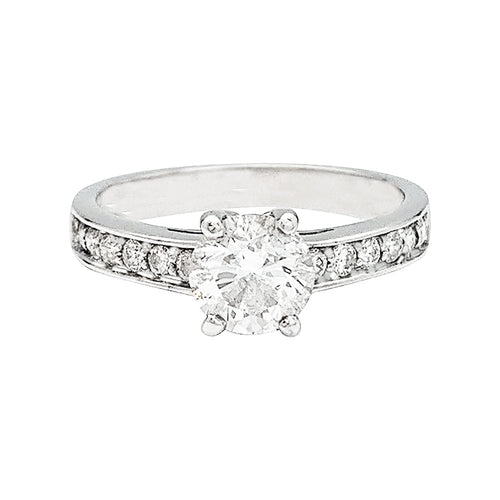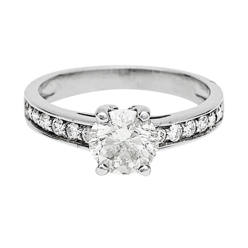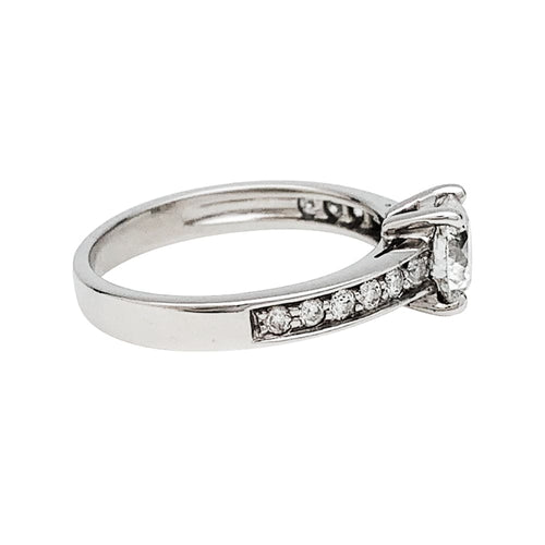 Een witgouden ring van 750/000, met in het midden een briljant geslepen diamant van 0,80 karaat, kleur F, zuiverheid SI1, ondersteund door kleine diamanten.