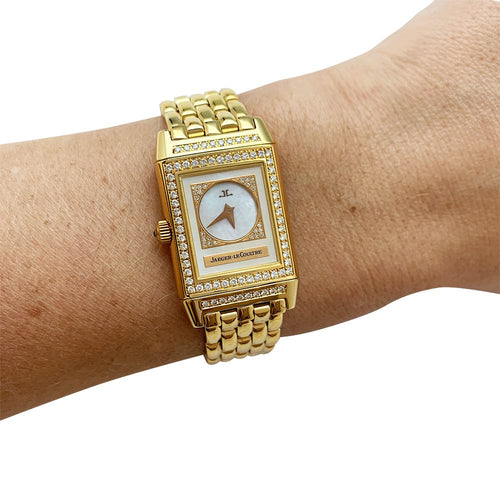 Een door Jaeger Lecoultre gesigneerd horloge, model 'Reverso Duetto' in 750/000 geelgoud, armband en dubbele vouwsluiting in 750/000 geelgoud. De voor- en achterkant zijn verfraaid met wit parelmoer en diamanten, diamanten lunette.