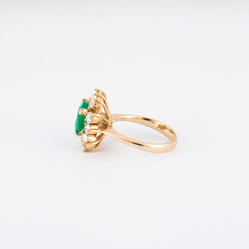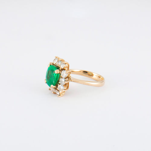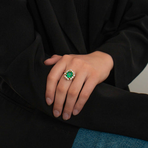 Ring van 18K 750 duizendste geelgoud, gecentreerd op een levendig groene, kussengeslepen Colombiaanse smaragd van ongeveer 2,20 ct met certificaat in een rand van 12 diamanten.