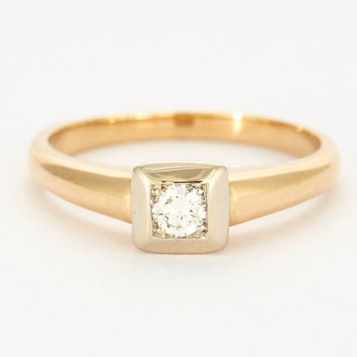Solitaire ring van 18K (750 duizendste) geelgoud en witgoud, met in het midden een briljant geslepen diamant van ongeveer 0,17 karaat in een vierkante omlijsting.