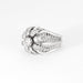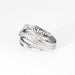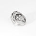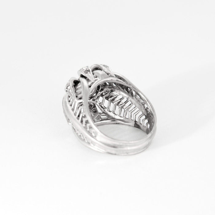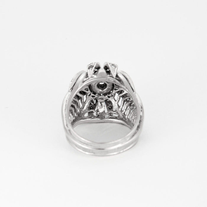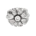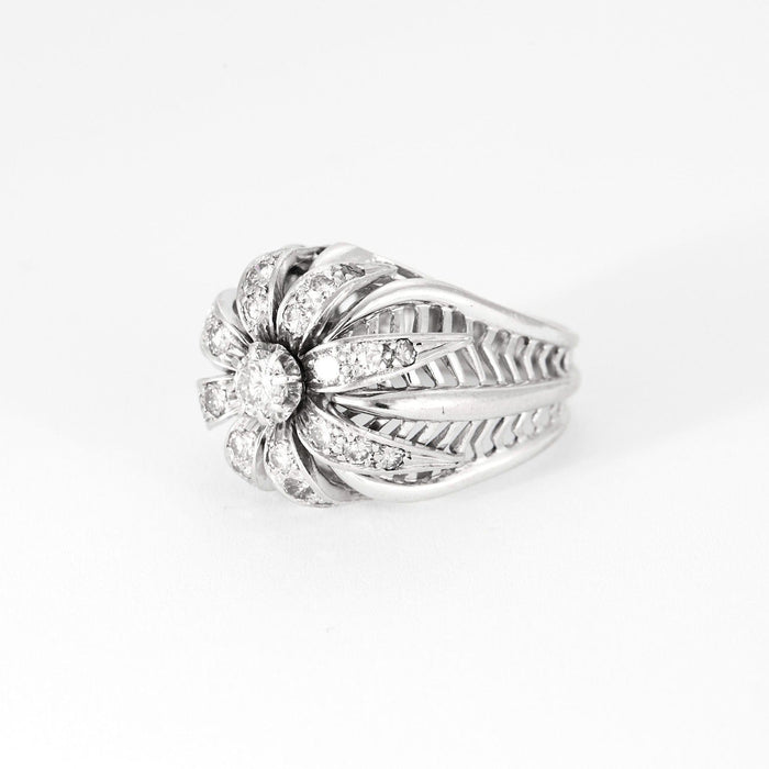 Koepelvormige ring van 18 karaat (750 duizendste) witgoud en 950 duizendste platina, met een centraal motief dat een bloem voorstelt. De stamper en de acht bloemblaadjes zijn bezet met ronde briljant geslepen diamanten en 8/8 diamanten. Het ringlichaam is versierd met opengewerkte chevrons.