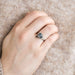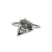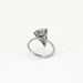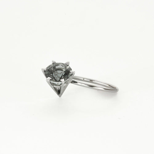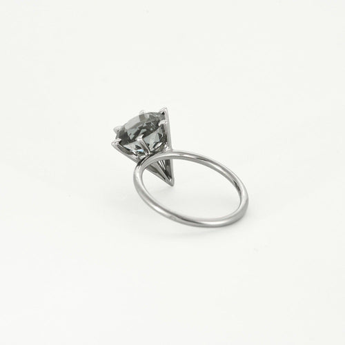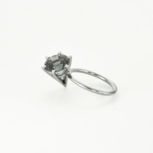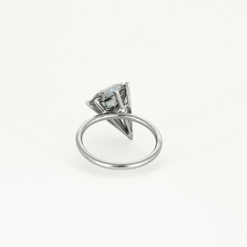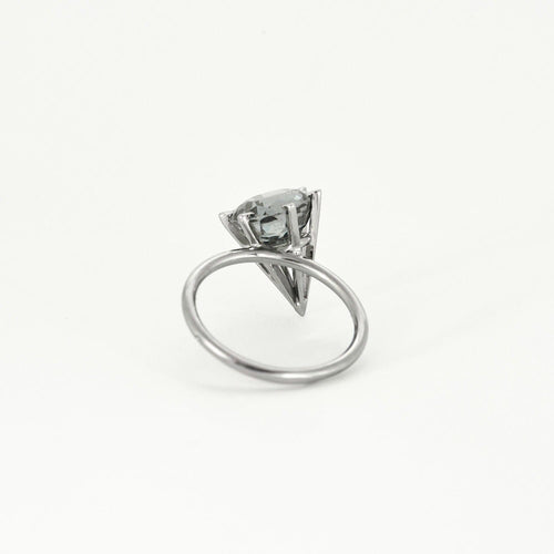 Ring van 18 karaat (750 duizendste) witgoud, versierd met een blauwgrijze toermalijn, gezet met zes klauwen in een excentrische en schuine kegelvormige lunette.