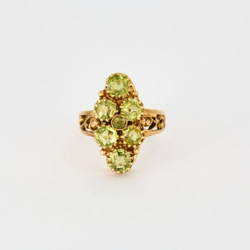 Shuttle-ring van 18K (750 duizendste) geelgoud met een verhoogde ring bezet met zeven gefacetteerde ronde peridots in een twaalftandige zetting van elk ongeveer 0,65 karaat, inclusief een kleinere centrale in een gesloten zetting. Het ringlichaam is gedeeltelijk versierd met krullen. Frans werk uit de 19e eeuw.