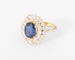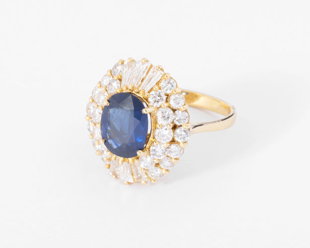 Daisy-ring versierd in het midden met een ovale saffier van ongeveer 2,80 ct, omgeven door een dubbele rij diamanten in ronde en baguette-diamanten.