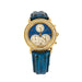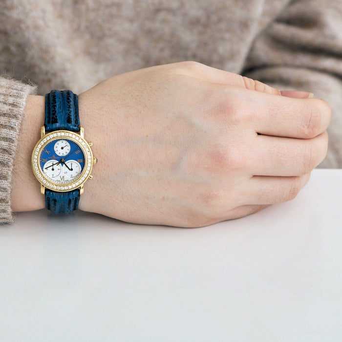BAUME & MERCIER - Zeldzaam chronograafhorloge voor dames, referentie 86604, in 18-karaats geelgoud (750/°°°), de lunette bezet met diamanten van circa 0,5 ct, de wijzerplaat is geëmailleerd in blauw en wit, met Romeinse cijferindexen van goud, datum- en chronograaffuncties.
