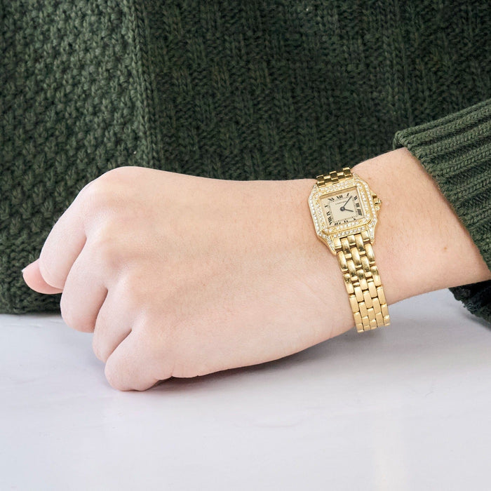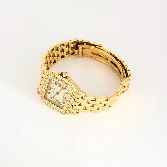 CARTIER- Panthère - Medium Model - Dameshorloge in 18K (750 duizendsten) geelgoud, kast bezet met twee rijen diamanten van circa 1 karaat (geschatte waarde E/F-VS). Beige wijzerplaat met Romeinse cijferindexen. Dubbele vouwsluiting. Kwartsuurwerk. Winder bezet met een diamant.
