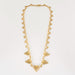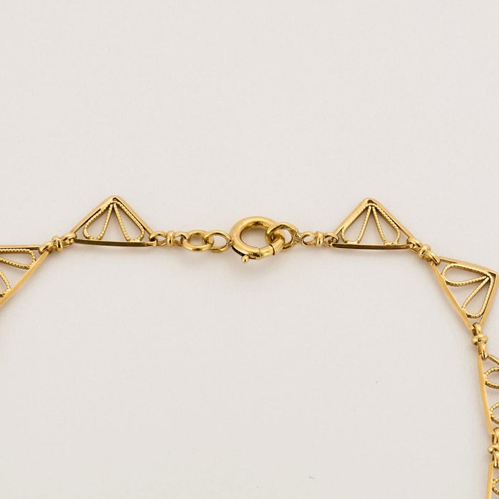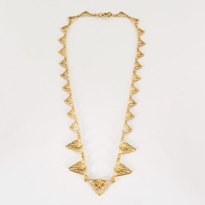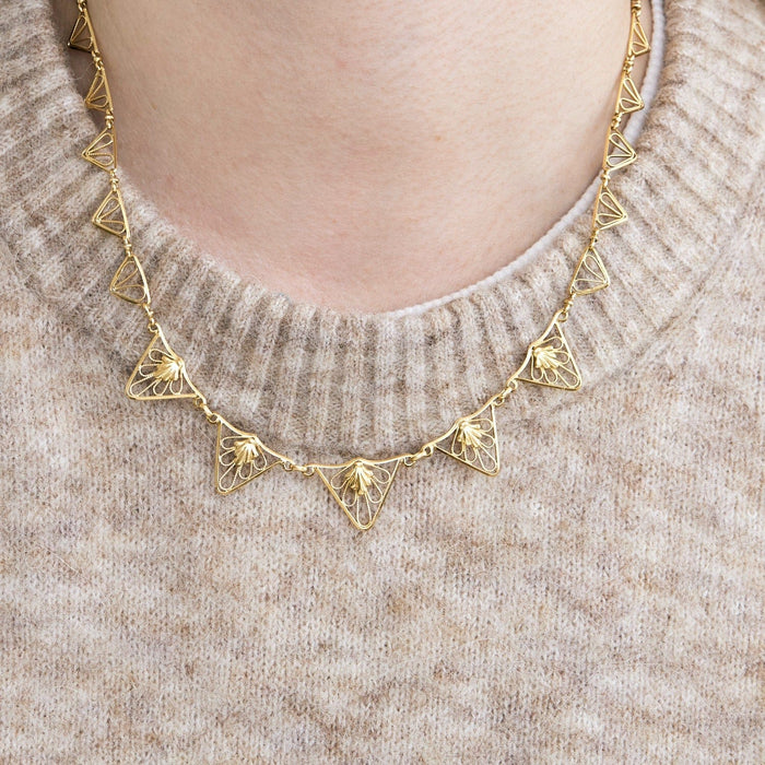 Draperie-ketting van 18 karaat (750 duizendste) geelgoud, samengesteld uit driehoekige filigraan-maaspatronen.