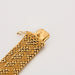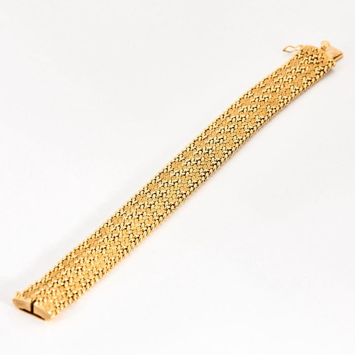 Zachte lintarmband met gevlochten gaas in 18K (750 duizendste) geelgoud, effen en amati. De ratelsluiting met acht veiligheid.