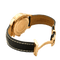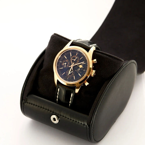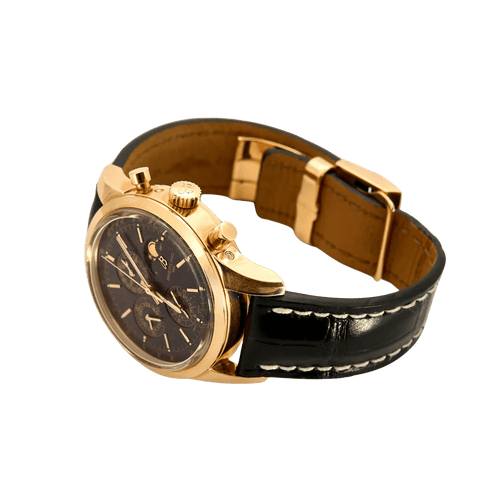 De zwarte wijzerplaat heeft gouden inscripties. Drie subdials op 6, 9 en 12 uur omvatten dubbele ringen voor de chronograaf- en kalenderfuncties, met een maanfase-indicator op 3 uur en een tachymeterschaal rond de wijzerplaat.