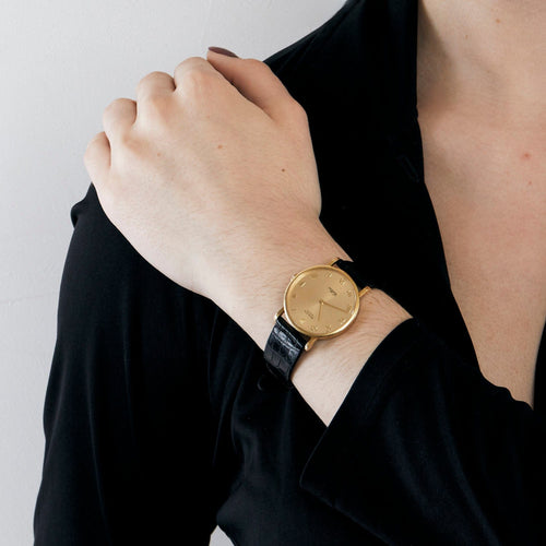 Elegant damespolshorloge in 18-karaats (750/°°°) geelgoud met een gouden wijzerplaat, toegepaste indexen met Romeinse cijfers. Achterkant van het horloge gegraveerd met het horlogenummer en 18K gouden aanduiding.