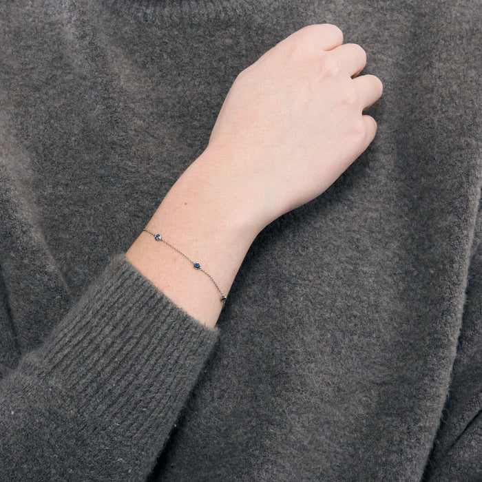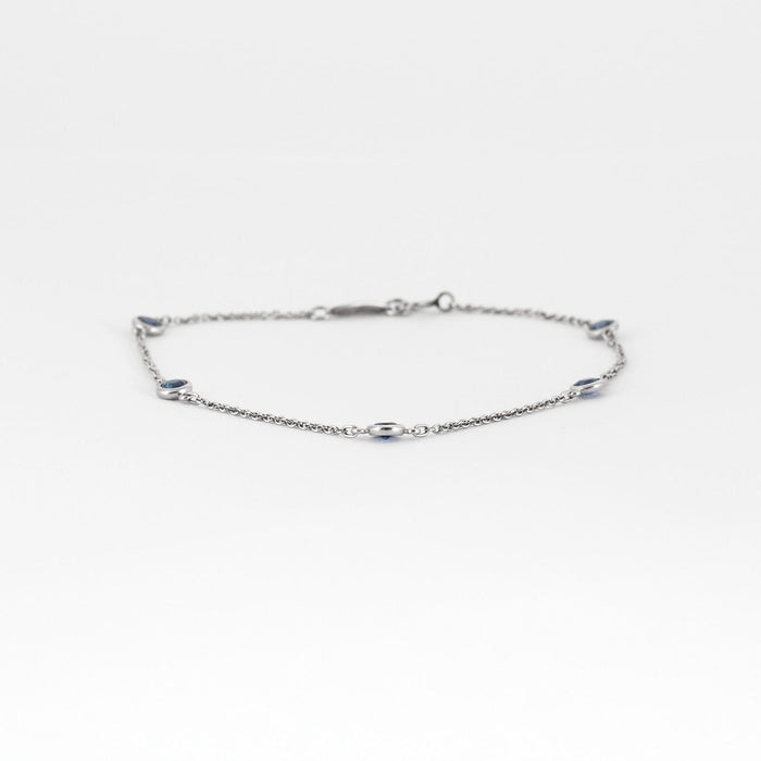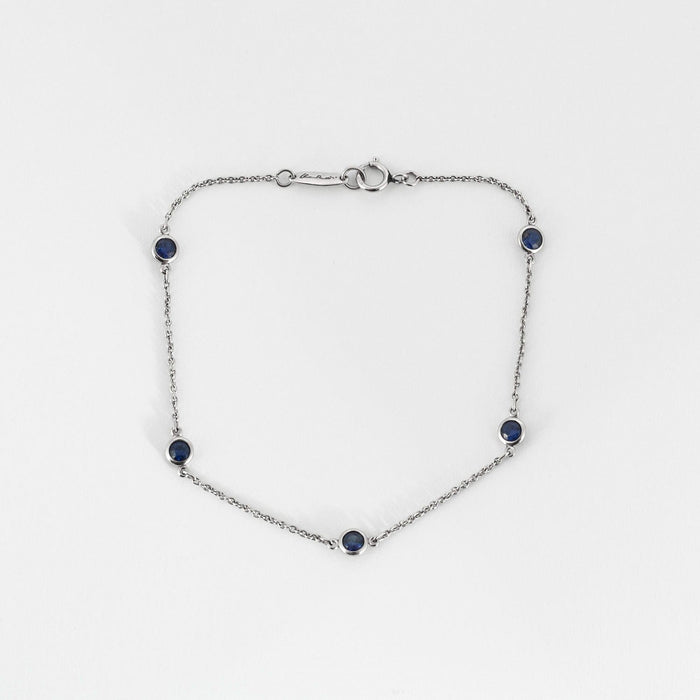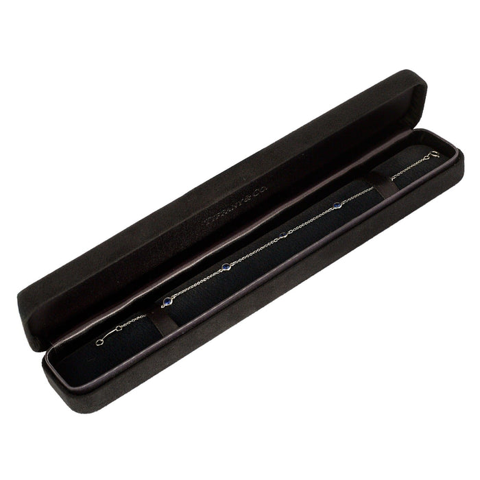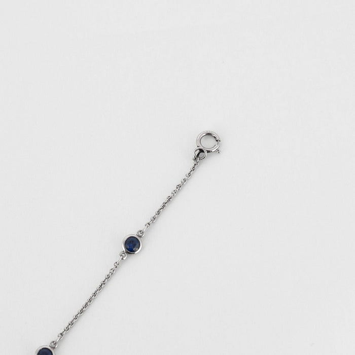 TIFFANY & Co en Elsa Peretti - “Color by the Yard”-armband in platina, bestaande uit een fijne schakel van een veroordeelde, afgewisseld met vijf gefacetteerde ronde saffieren in een ringzetting. Veerringsluiting.