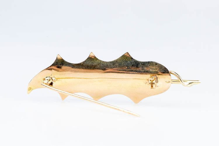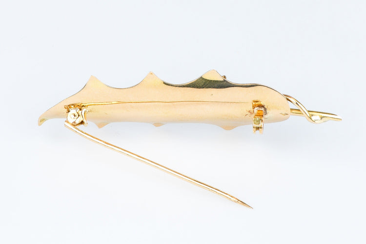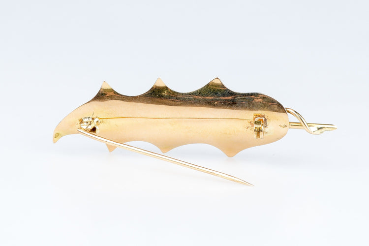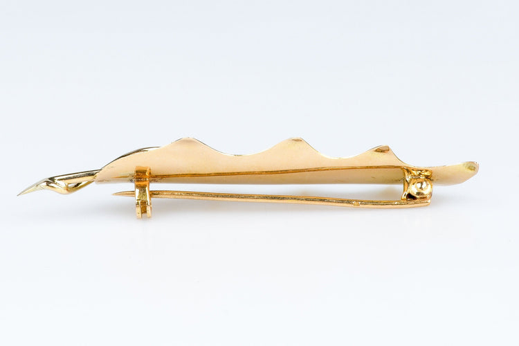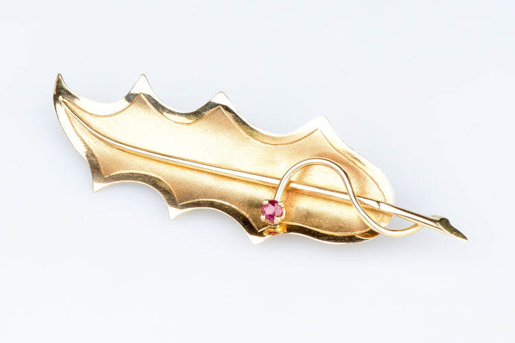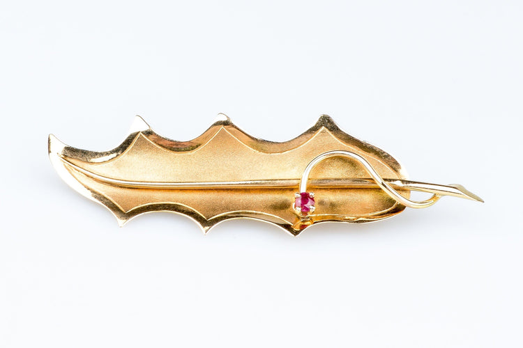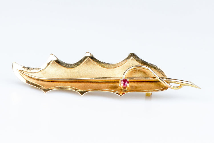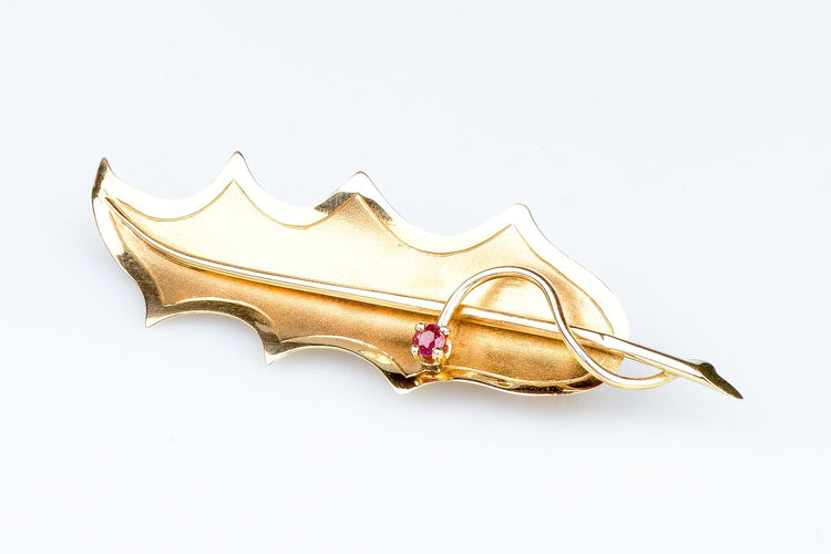 Brooch in 18-carat yellow gold set with a central ruby of 0.12 carats.