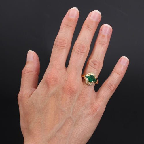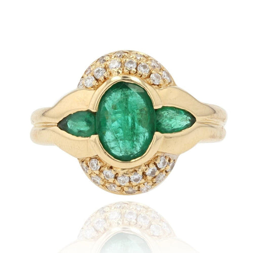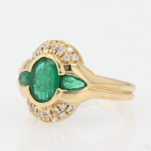 - Domed, this emerald ring second-hand is adorned with an oval emerald supported by drop emeralds. It is lined on each side with a pavé of brilliant-cut diamonds.