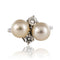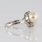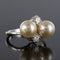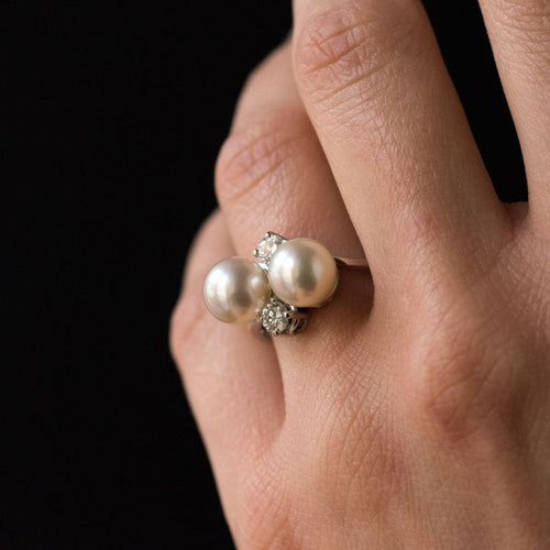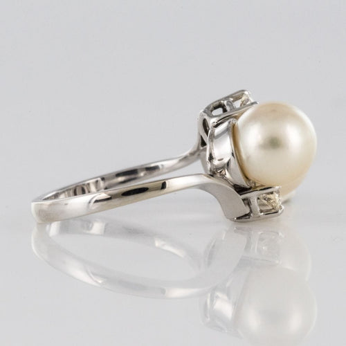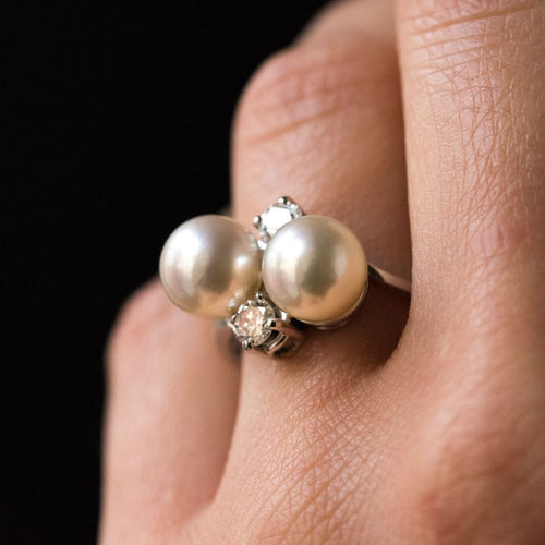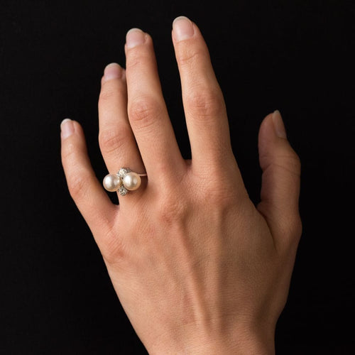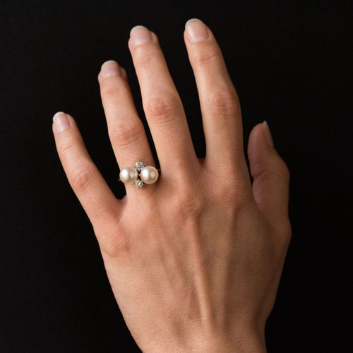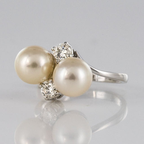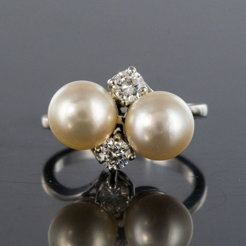 This lovely and feminine contemporary ring is set with 2 white oriental cultured pearls and 2 modern brilliant-cut diamonds.