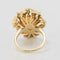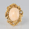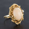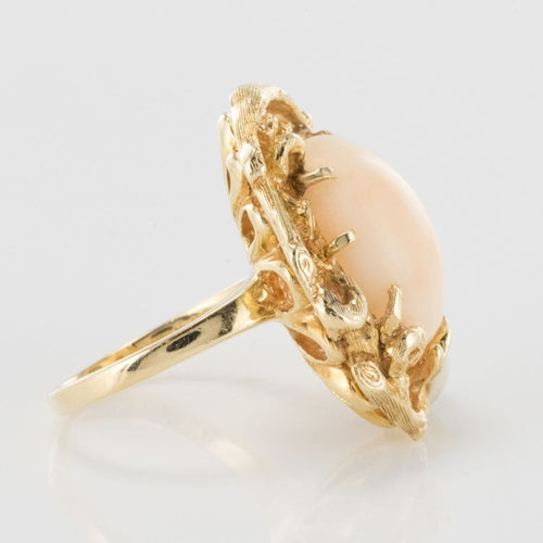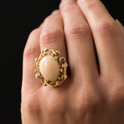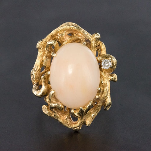 Yellow gold ring, 585 thousandths, 14 carats. This lovely ring with asymmetrical lines is prong-set with a little angel coral cabochon in a knotty, chiseled setting, like a branch which frames the gem. A brilliant-cut diamond is prong-set on one side.