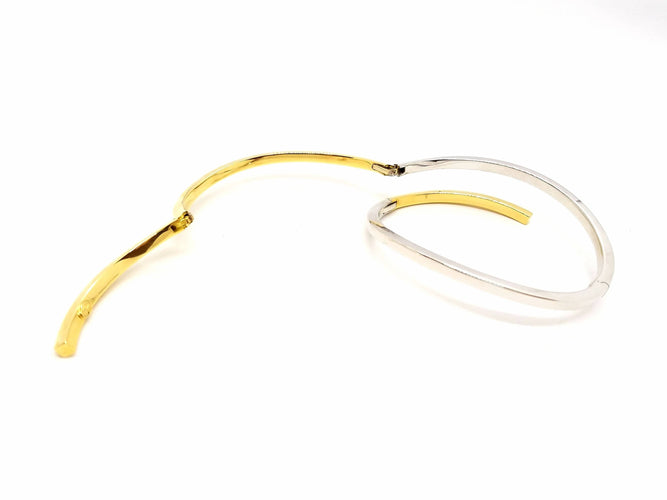 Rigid articulated bracelet, two-tone, in 750 thousandths (18 carat) white and yellow gold, opening in 5 parts, square wire, size: 19 cm, total width: 2.6 cm, width of one wire: 0.34 cm, total weight: 26.22 g, stamped on the end, excellent condition
