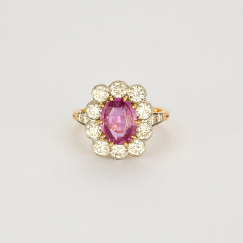 Ring Daisy in 18 carat yellow gold and platinum 950 set in the center with a magnificent unheated pink sapphire surrounded by diamonds.