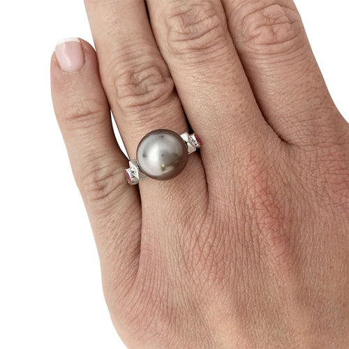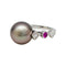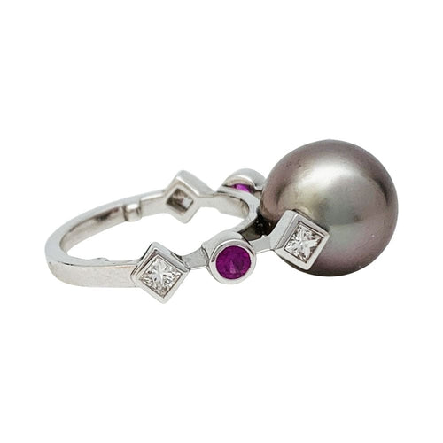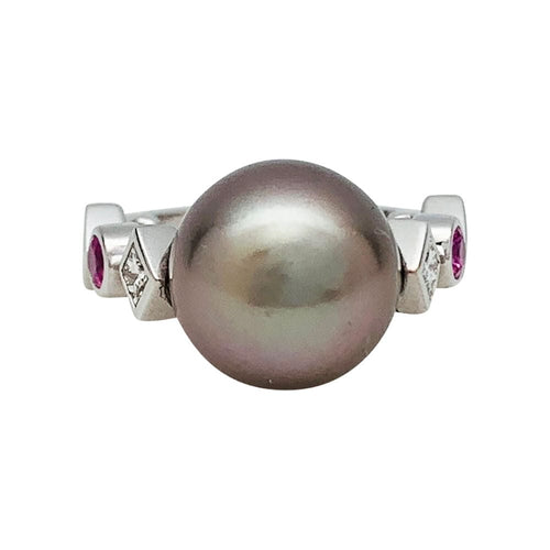 A ring Chaumet, "Clarisse" collection, in 750/000 white gold set with a very pretty pink-grey Tahitian pearl, supported by 4 square diamonds and 2 pink sapphires.