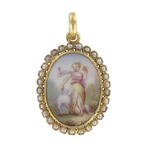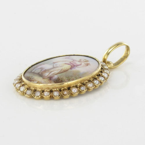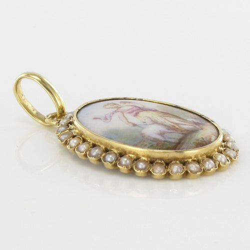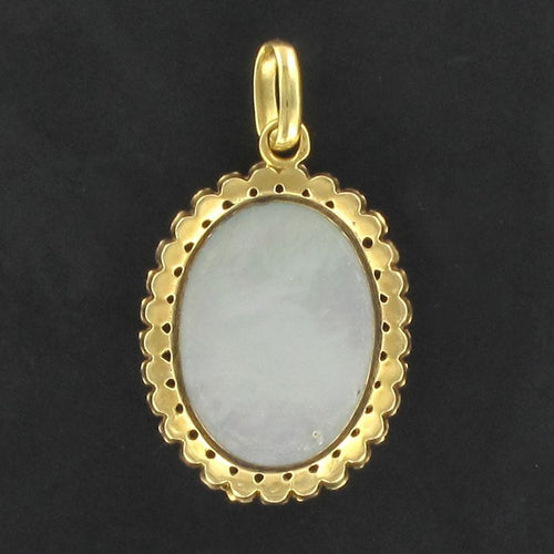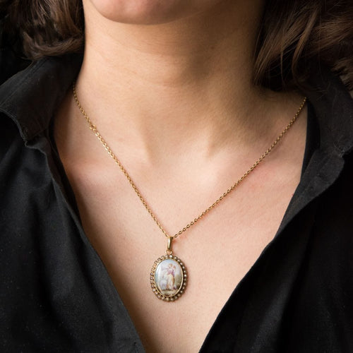 Pendant in yellow gold, 750 thousandths, 18 carats, eagle's head hallmark. Oval in shape, this old pendant is bezel-set in the center of a porcelain miniature surrounded by fine half-pearls also bezel-set. The back of the miniature is made of mother-of-pearl.