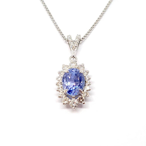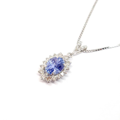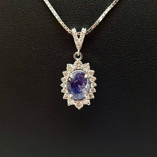 An 18-carat 750/1000 white gold sapphire diamond necklace, maker's mark & 750. A splendid quality necklace, combining a simple and elegant assembly of a 38 cm Venetian chain. This pretty 18-carat gold necklace set with a sapphire of 2.65 carats in total and twenty-three round brilliant diamonds of 0.43 carat in total.