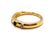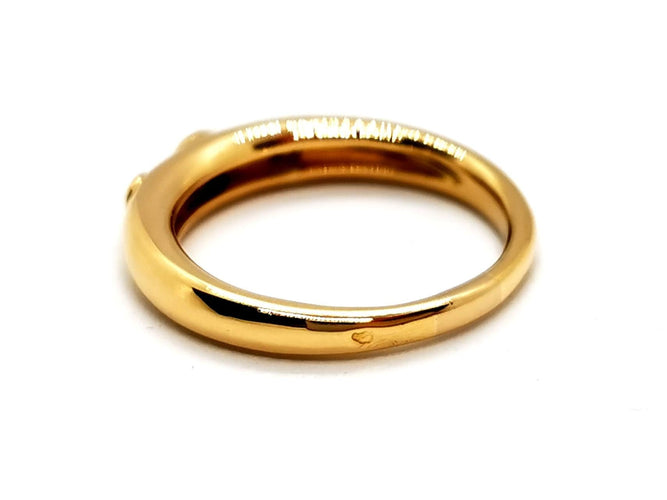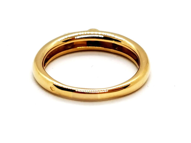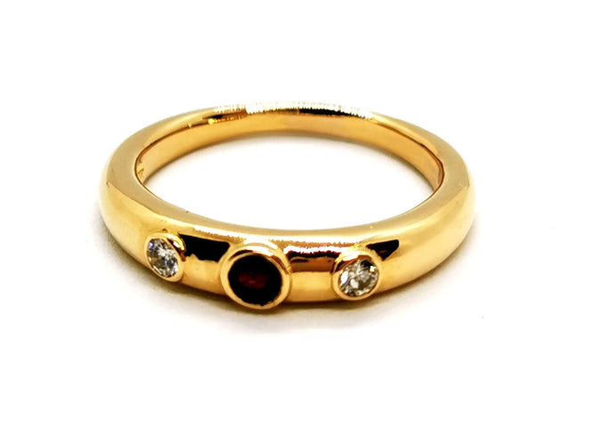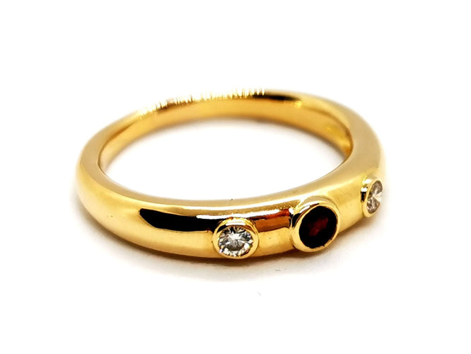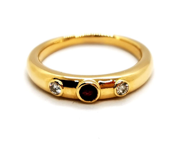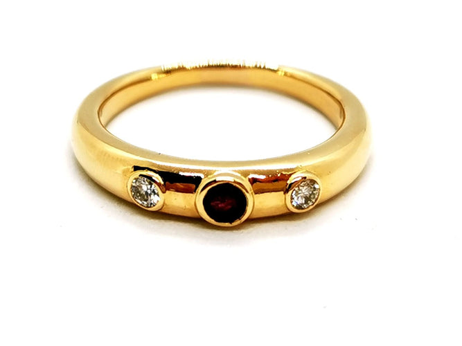 Ring in 750 thousandths (18 carat) yellow gold, set with a round ruby of approximately 0.11 ct, and supported by two diamonds, brilliant cut G/VS of approximately 0.05 ct each, total diamond weight: approximately 0.10 ct, size: 56, width on top: 0.41 cm, total weight: 5.28 g, eagle's head hallmark, excellent condition
