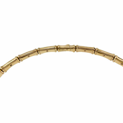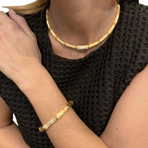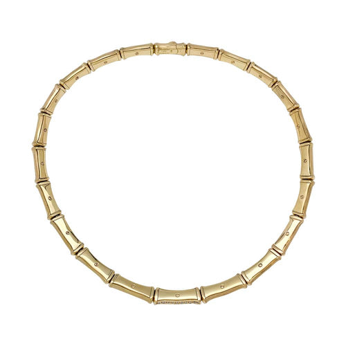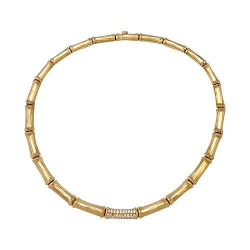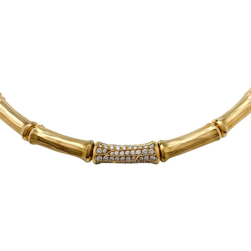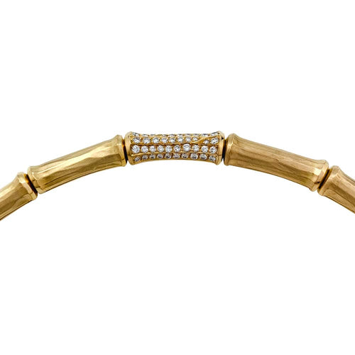 An articulated collar branded of the House Cartier in 750/000 yellow gold, model "Bamboo", from the "Route des Indes" collection in matte and polished gold. The link in the center is paved with diamonds.