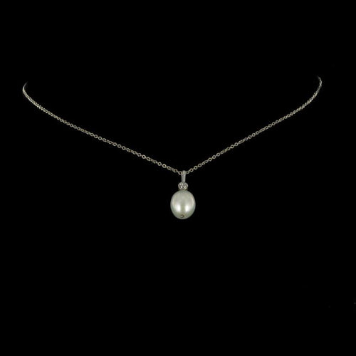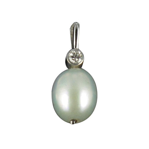 Pendant in white gold, 750/1000th, 18 carats. It is made up of a white oriental olive cultured pearl topped with a bezel-set diamond.