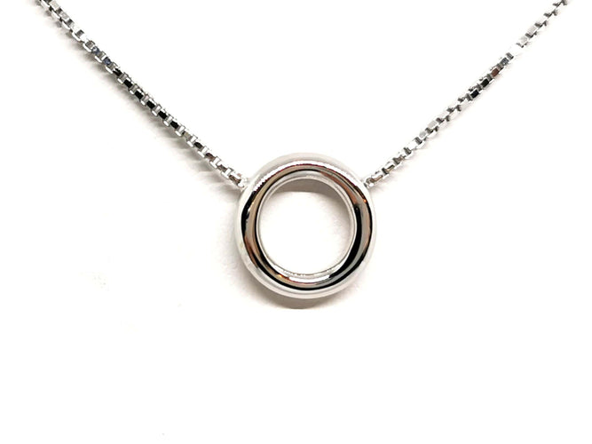 Venetian chain necklace, and circular pendant, in 750 thousandths (18 carat) white gold, length of the chain: 47 cm with intermediate rings at 44 cm and 41 cm, dimensions of the pendant: 1.49 cm x 0.27 cm, weight total: 9.74 g, eagle's head hallmark, excellent condition