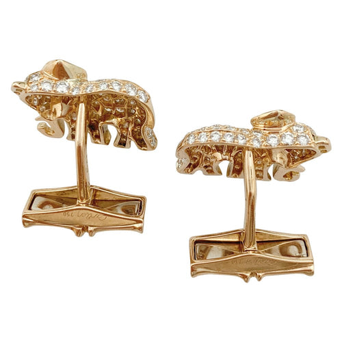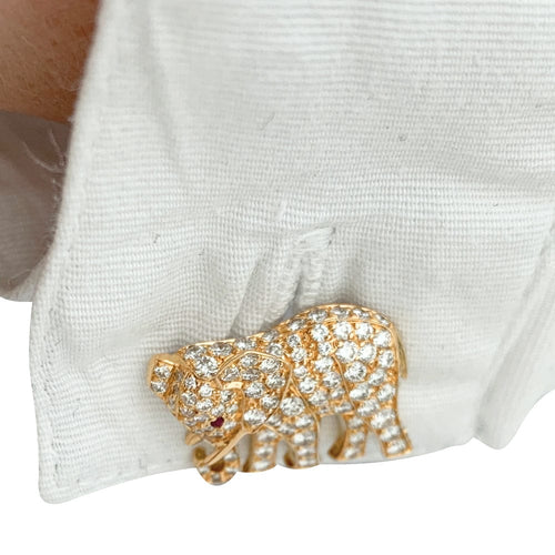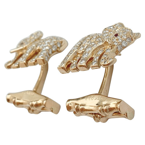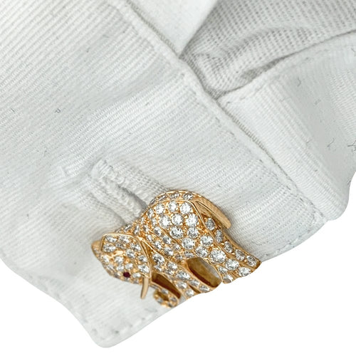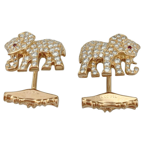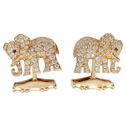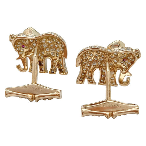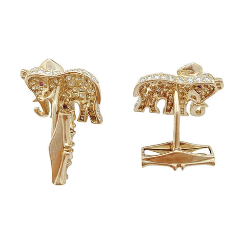 Cufflinks branded Cartier representing Elephants in 750/000 yellow gold set with brilliants, the eyes are decorated with rubies.
