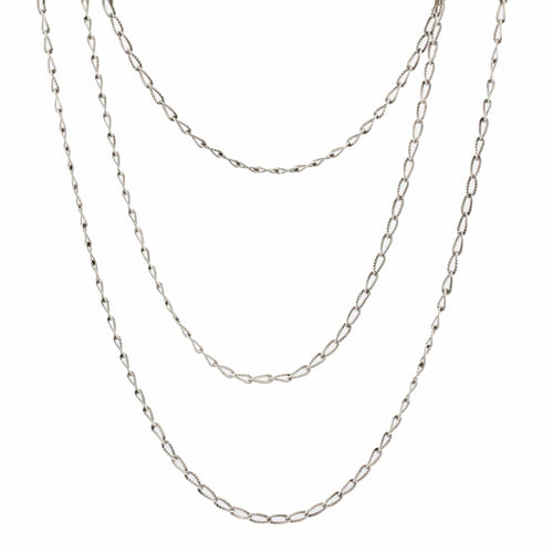 - Long old necklace in silver, it is made up of an alternating stitch chiseled in two ways, each pattern being attached to the other. The hanging system of this old necklace is a spring ring.